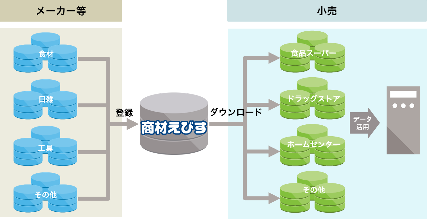 「商材えびす」とは、各業界毎に企業を越えた商品情報運用を実現する、商品詳細データプールサービスです。メーカーは商品データを一度登録するだけで、複数の利用小売へ一括して提供できます。小売は、メーカーによって登録された、多様な項目と精度の高い商品データを、販売促進用途やECサイト等に利用できます。